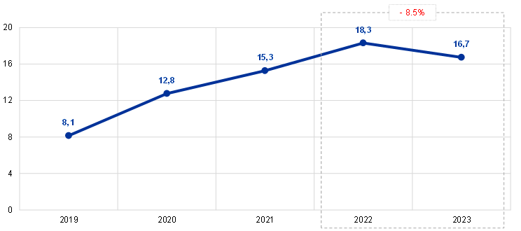 В края на 2023 г. общата стойност на евробанкнотите в обращение е 1567,7 млрд. евро – практически същата като в края на 2022 г. ЕЦБ има дял от 8% от общата стойност на евробанкнотите в обращение. Това се равнява на 125,4 млрд. евро в края на годината. Тъй като самата ЕЦБ не емитира банкноти, тя има вземания в рамките на Евросистемата от НЦБ от еврозоната на стойност, равна на стойността на нейния дял от евробанкнотите в обращение.
