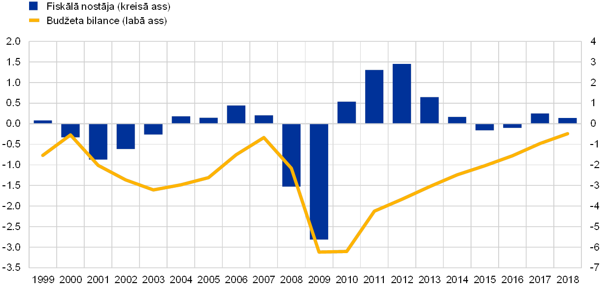 Euro zonas valstu valdības budžeta deficīta rādītājs 2018. gadā turpināja samazināties, sasniedzot 0.6% no IKP. Tāds rādītājs kopš Ekonomikas un monetārās savienības (EMS) darbības sākuma 1999. gadā novērots reti (sk. 7. att.). Tāpat kā dažos pēdējos gados, kopējā budžeta deficīta kritumu lielā mērā noteica labvēlīgu ciklisko norišu rezultāts vienlaikus ar procentu izdevumu samazināšanos, turpinot aizstāt augstu izmaksu parāda finansējumu, kad tam pienāk termiņš, ar jauniem parāda vērtspapīriem, kas emitēti ar zemākām procentu likmēm. Euro zonas fiskālā nostāja[6] 2018. gadā bija kopumā neitrāla, lai gan euro zonas kopējais rādītājs slēpa būtiskas atšķirības dažādās valstīs – lieli neplānoti papildu ieņēmumi dažās valstīs kopumā kompensēja prociklisku fiskālās politikas stingrības mazināšanos mazāk aizsargātās valstīs.