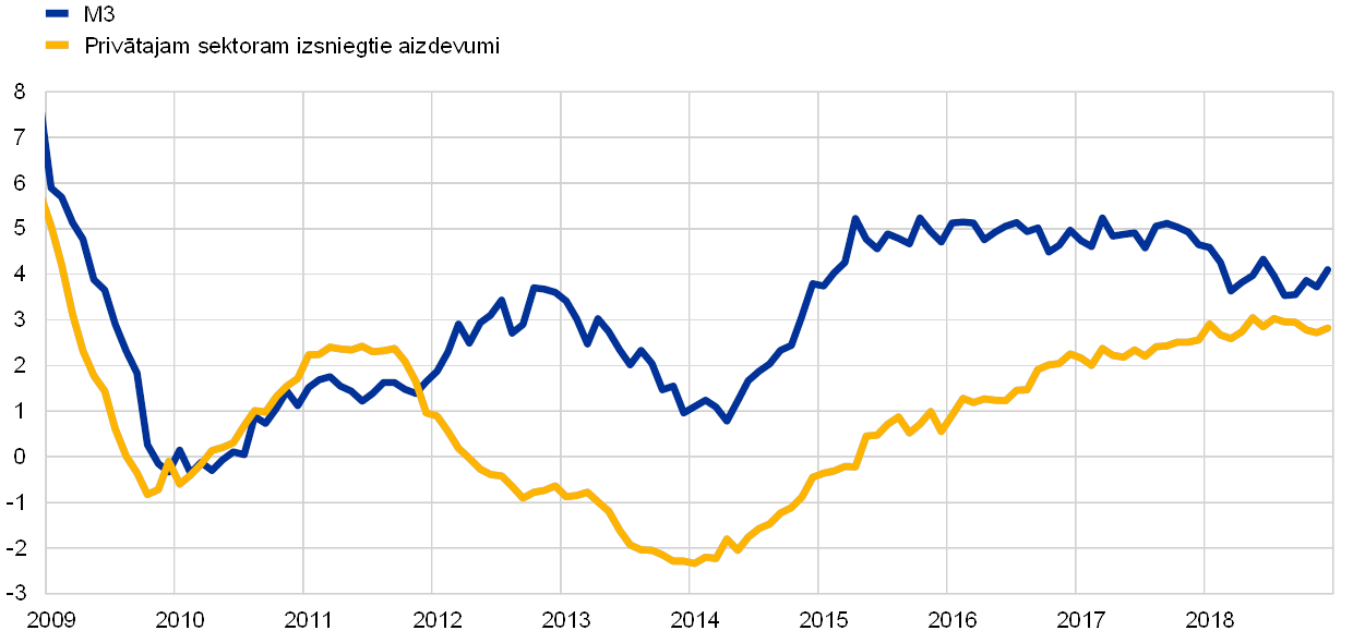 Pēc 2017. gadā vērotās īpaši spēcīgās izaugsmes dinamikas euro zonas ekonomiskais kāpums turpinājās arī 2018. gadā, tomēr pieauguma temps bija mērenāks. To noteica ārējā pieprasījuma pavājināšanās un daži atsevišķām valstīm un sektoriem raksturīgi izaugsmi mazinoši faktori. Vienlaikus iekšzemes pieprasījuma kāpuma pamatā esošie faktori saglabājās. Turpmāki uzlabojumi darba tirgos veicināja privāto patēriņu, bet ieguldījumus uzņēmējdarbībā joprojām pozitīvi ietekmēja labvēlīgi finansēšanas nosacījumi un bilanču uzlabošanās. Darba tirgu paplašināšanās un arvien ierobežotāks darbaspēka piedāvājums arī noteica turpmāku iekšzemes cenu spiediena pastiprināšanos un paplašināšanos. Vienlaikus pamatinflācijas rādītāju pieaugums kopumā joprojām bija neliels. Tomēr nākotnē gaidāms, ka pamatinflācija vidējā termiņā pakāpeniski palielināsies. To veicinās ECB monetārās politikas pasākumi, turpmāka ekonomiskā izaugsme un straujāks darba samaksas kāpums.