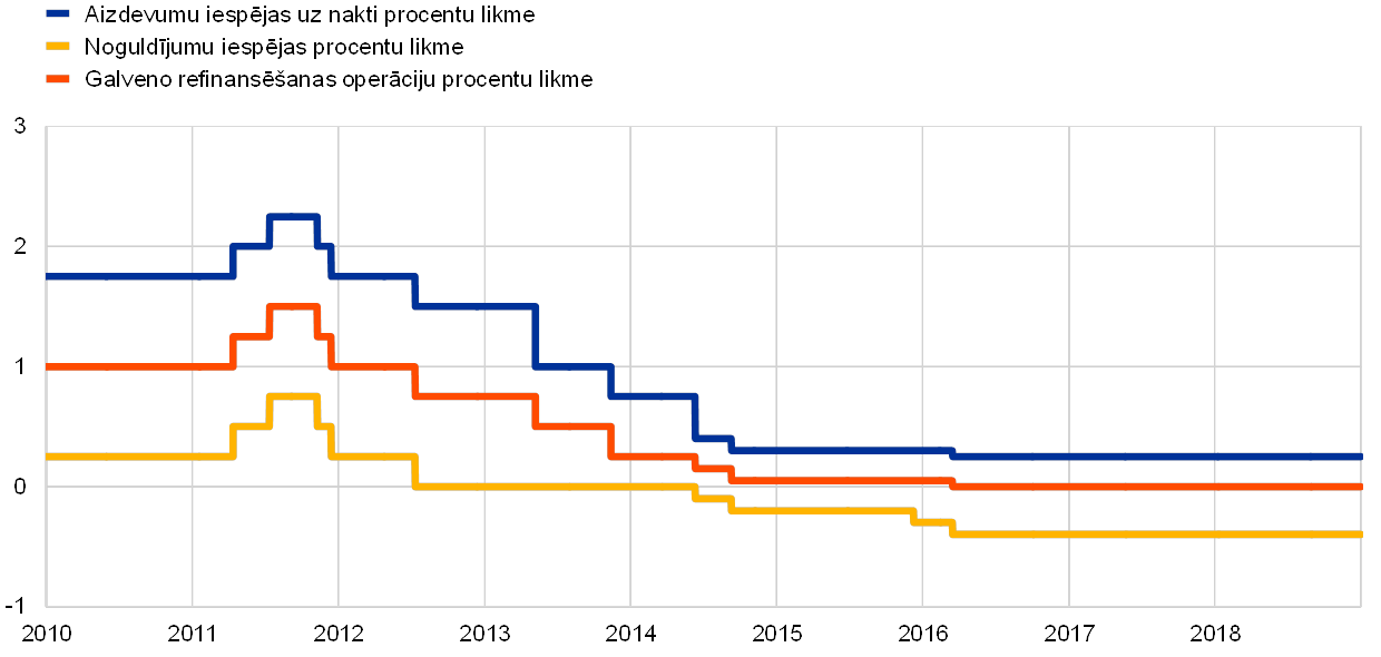 Tāpēc Padome 2018. gada jūnijā paredzēja ar septembri samazināt aktīvu iegādes programmas (AIP) ietvaros veikto neto aktīvu iegāžu mēneša apjomu līdz 15 mljrd. euro un pēc tam decembrī – ja saņemtie dati joprojām apstiprinās tās vidējā termiņa inflācijas perspektīvu – neto iegādes pārtraukt. Vienlaikus Padome paziņoja, ka paredz galveno ECB procentu likmju saglabāšanos pašreizējā līmenī vismaz līdz 2019. gada vasarai[1] un jebkurā gadījumā tik ilgi, cik tas būs nepieciešams, lai nodrošinātu inflācijas līmeņa attīstības turpmāku atbilstību noturīgas inflācijas līmeņa korekcijas gaidām.