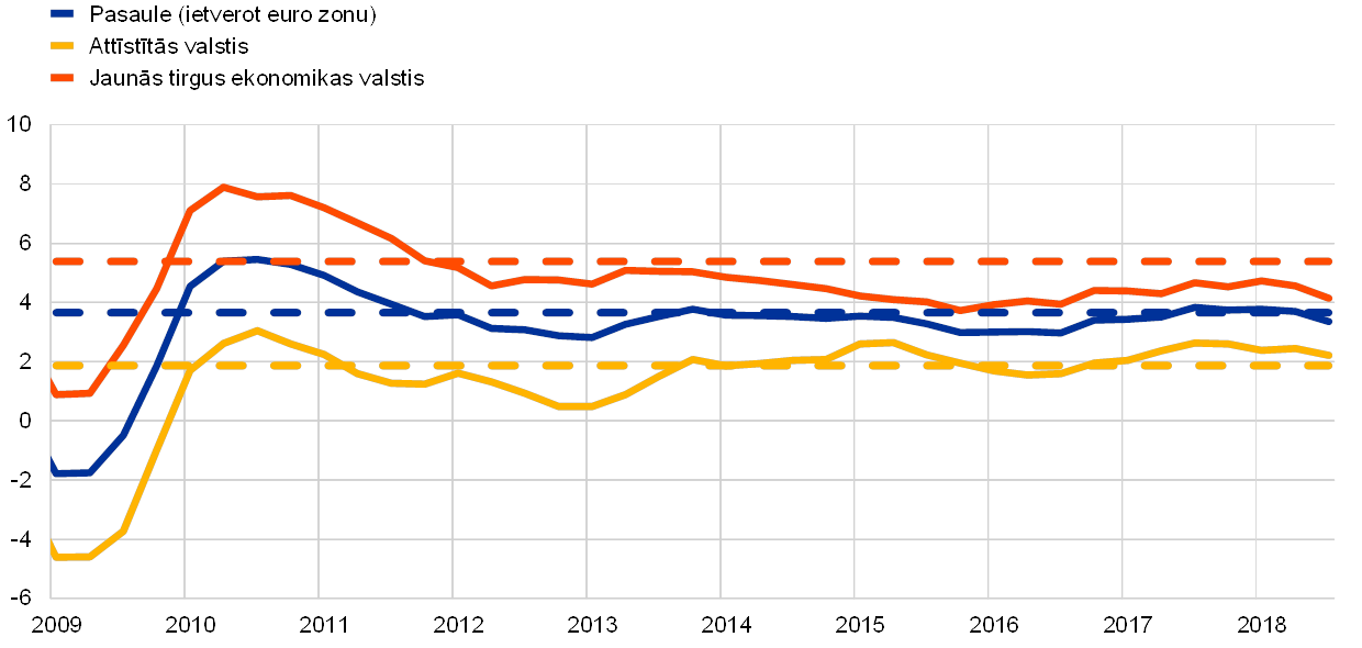 Pasaules ekonomiskā izaugsme 2018. gada pirmajos trijos ceturkšņos turpinājās stabilā tempā (3.6%), kas līdzīgs iepriekšējā gada tempam un tuvs ilgtermiņa vidējam rādītājam (sk. 1. att.). Tomēr salīdzinājumā ar iepriekšējiem gadiem ekonomiskās aktivitātes kāpums valstu dalījumā bija nevienmērīgāks un mazāk sinhrons. Lai gan ASV izaugsme joprojām bija stabila, vairākās citās valstīs, t.sk. Japānā un dažās jaunajās tirgus ekonomikas valstīs, īpaši Turcijā un Argentīnā, tās temps saruka. 2. pusgadā aktivitātes kāpums samazinājās arī Ķīnā. Atsevišķu komponentu dalījumā kritās rūpnieciskās ražošanas un pasaules tirdzniecības kāpuma temps, bet privātā patēriņa pieaugums saglabājās stabils.