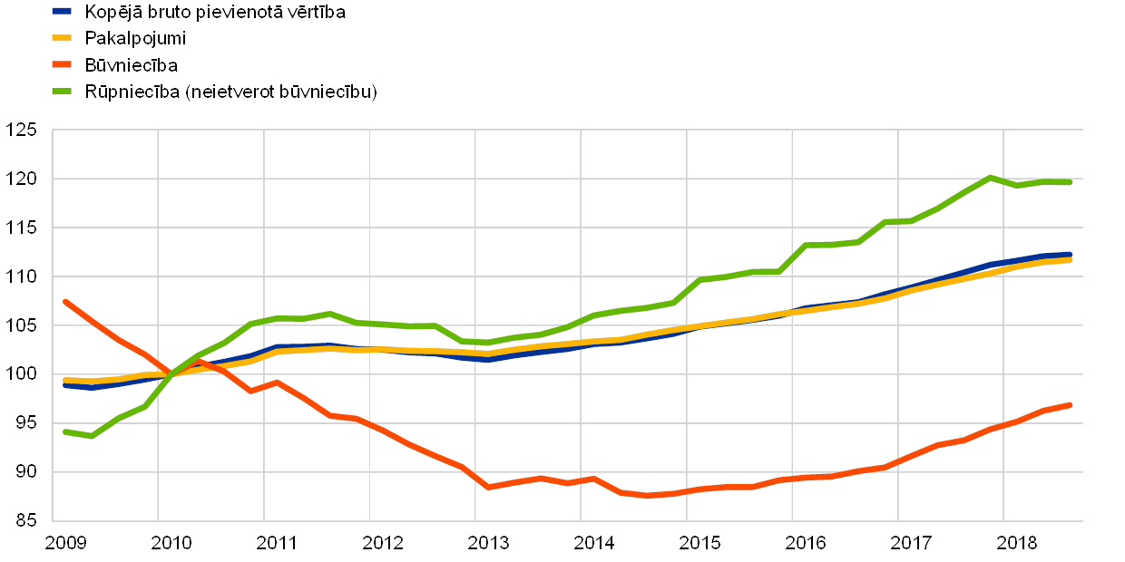 Produkcijas izlaides palielināšanās 2018. gadā joprojām bija plaši vērojama dažādās tautsaimniecības nozarēs (sk. 5. att.). Kopējā bruto pievienotā vērtība turpināja augt (aptuveni par 2%). Šis pieaugums bija nedaudz mazāks nekā iepriekšējā gadā, bet tuvu 2015. un 2016. gadā reģistrētajam tempam. Gan rūpniecības (neietverot būvniecību) pievienotā vērtība, gan pakalpojumu nozares pievienotā vērtība 2018. gadā pieauga aptuveni par 2%. Vienlaikus pievienotā vērtība būvniecībā turpināja palielināties (aptuveni par 4.0%), lai gan kāpuma temps vēl joprojām bija zemāks par līmeni, kas tika sasniegts pirms krīzes. Tas vēlreiz apliecināja, ka būvniecības nozare arvien straujāk atveseļojas no ieilgušā lejupslīdes vai lēnas attīstības perioda, kas iestājās 2008. gadā, sākoties finanšu krīzei.