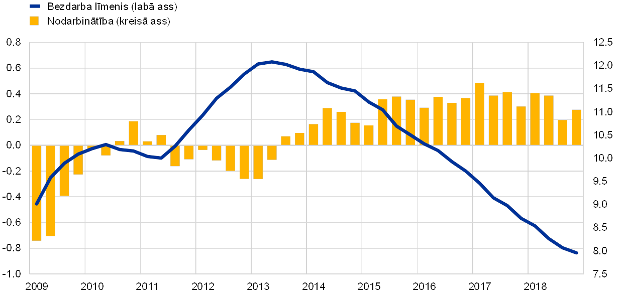 Euro zonas darba tirgi 2018. gadā turpināja atveseļoties (sk. 6. att.). Bezdarba līmenis 2018. gadā turpināja sarukt, decembrī sasniedzot 7.8% (zemākais līmenis kopš 2008. gada oktobra). Bezdarba sarukums, kas sākās 2013. gada 2. pusgadā, bijis plaši vērojams visās dzimuma un vecuma grupās, tomēr bezdarba līmenis dažādās euro zonas valstīs joprojām būtiski atšķiras. Līdz gada 4. ceturksnim nodarbināto skaits euro zonā jau bija pārsniedzis 2017. gada atbilstošā perioda līmeni par 1.3%, t.i., bija par 6.7% augstāks par pēdējo 2013. gada 2. ceturksnī sasniegto zemāko punktu. Visā atveseļošanās periodā nodarbināto skaits palielinājies aptuveni par 10 milj. Tādējādi nodarbinātības līmenis pārsniedzis pirms krīzes 2008. gada 1. ceturksnī sasniegto augstāko punktu. Nodarbinātības pieaugums atveseļošanās laikā bijis plaši vērojams gan valstu, gan nozaru dalījumā, un tas risinājies turpmāka darbaspēka piedāvājuma pieauguma apstākļos.