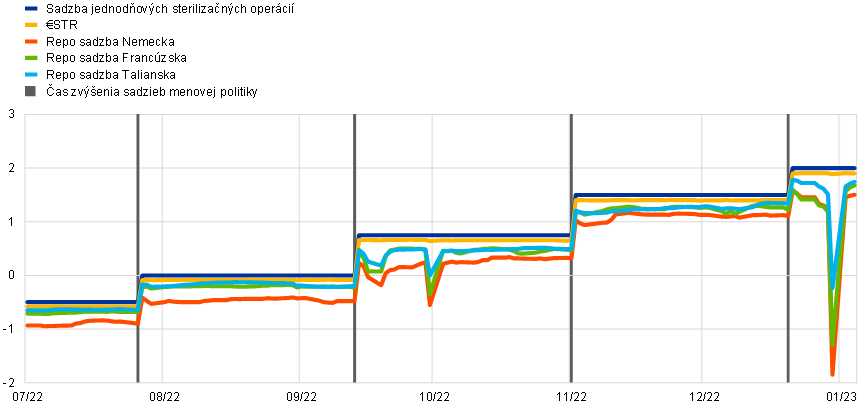 V decembri sme preto v nadväznosti na naše posledné zasadanie menovej politiky v roku oznámili, že je potrebný ďalší výrazný rovnomerný rast úrokových sadzieb až na úroveň, ktorá je dostatočne reštriktívna na zabezpečenie včasného návratu inflácie k našej cieľovej úrovni. Zároveň sme uviedli, že hoci kľúčové úrokové sadzby ECB zostávajú naším prvoradým nástrojom pri určovaní nastavenia menovej politiky, plánujeme začať postupným a predvídateľným tempom znižovať objem portfólia cenných papierov nadobudnutých v rámci programu APP. Tomuto kroku zároveň predchádzalo októbrové rozhodnutie o rekalibrácii podmienok tretej série našich cielených dlhodobejších refinančných operácií, ktorým sa odstránili prekážky dobrovoľného predčasného splatenia nesplatených finančných prostriedkov. Od konca júna (keď sa skončil čistý nákup aktív) do konca decembra klesol objem menovopolitických aktív v našej súvahe o približne 830 mld. €, čo prispelo k normalizácii našej súvahy.