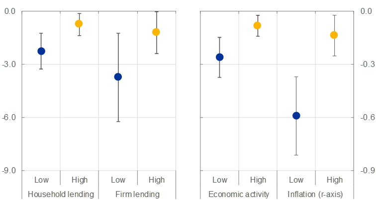 Source: Holm-Hadulla and Pool (2025). Impact of an exogenous 25 basis point interest rate hike. High (low) volatility defined as one standard deviation (ca. 7 basis points) above (below) average. Circles are point estimates, whiskers are the 90 percent confidence intervals.