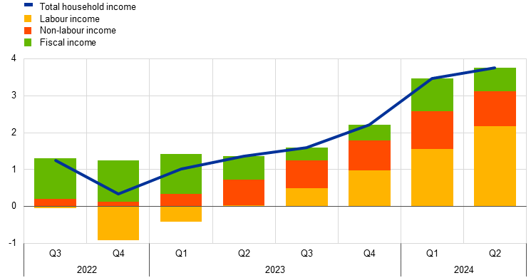 Strong income growth has contributed to the recent increase in the household saving rate. Real household income has increased by 3.8% over the last two years, thanks to strong growth in both labour and non-labour components (Chart B). The increase in non-labour income, which includes income from self-employment, net interest income, dividends and rents, is particularly favourable for savings.[3] This reflects the fact that non-labour income mainly accrues to richer households, who generally save more than poorer households.[4] In addition, fiscal policy has also supported real income growth since the third quarter of 2022. This can be largely attributed to the discretionary measures to mitigate the impact of the energy price shock, including substantial non-targeted income support. Since richer households have also benefited from the measures and consume a smaller share of their income, this may also have contributed to a higher saving rate.[5]