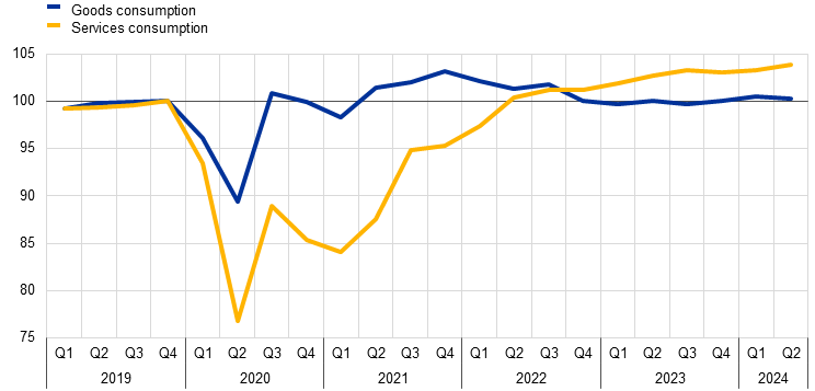 Although their income has risen strongly over the last two years, households have remained cautious about their spending. Following a post-pandemic rebound, real private consumption growth weakened markedly in the context of surging inflation and the subsequent tightening of monetary policy. The rise in inflation was driven in large part by a strong increase in energy and food prices, which led to a relatively sharp decline in the consumption of these goods.[6] The subsequent increases in interest rates encouraged saving and likely dampened the consumption of goods more than the consumption of services. The consumption of durable goods was particularly affected, as it is more sensitive to interest rates than services are.[7] Overall, consumption of goods fell back below its pre-pandemic level at the beginning of 2023 and has largely stagnated in the last two years. At the same time, consumption of services has continued to rise, but at a more moderate pace (Chart C).