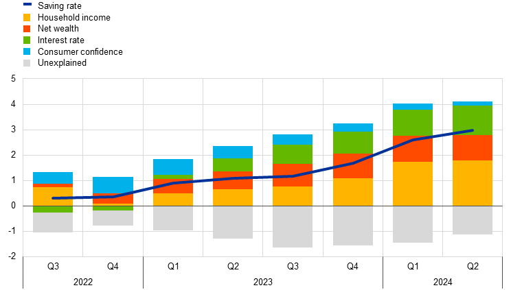 Note: The chart shows the contributions of real household income, real net wealth, real interest rates and consumer confidence to the cumulative changes in the household saving rate since the second quarter of 2022, based on an estimated error correction model for private consumption growth and taking the growth in real household income as given.