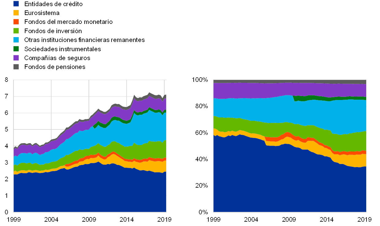 Fuente: BCE.Notas: Los activos agregados (no consolidados) de los subsectores incluyen activos financieros y excluyen activos no financieros. Entre las otras instituciones financieras remanentes se incluyen los agentes de valores y derivados, las instituciones financieras que se dedican a los préstamos (como las entidades de factoring o arrendamiento), las instituciones financieras especializadas (como las sociedades de capital riesgo, las sociedades que financian importaciones y exportaciones o algunas entidades de contrapartida central), los auxiliares financieros (como las sociedades de gestión de activos, los agentes de valores, los asesores de inversiones, los mercados o los agentes de seguros) y las instituciones financieras de ámbito limitado y los prestamistas de dinero (como las sociedades financieras de cartera, los vehículos de financiación de sociedades no financieras —que, por ejemplo, apoyan su emisión de valores representativos de deuda— y otras entidades que canalizan flujos financieros dentro de las sociedades no financieras). Los datos sobre los fondos del mercado monetario se presentan por separado de las entidades de crédito a partir del T1 2006. Los datos sobre las sociedades instrumentales, que son empresas que llevan a cabo operaciones de titulización, se presentan por separado de las otras instituciones financieras remanentes a partir del T4 2009.