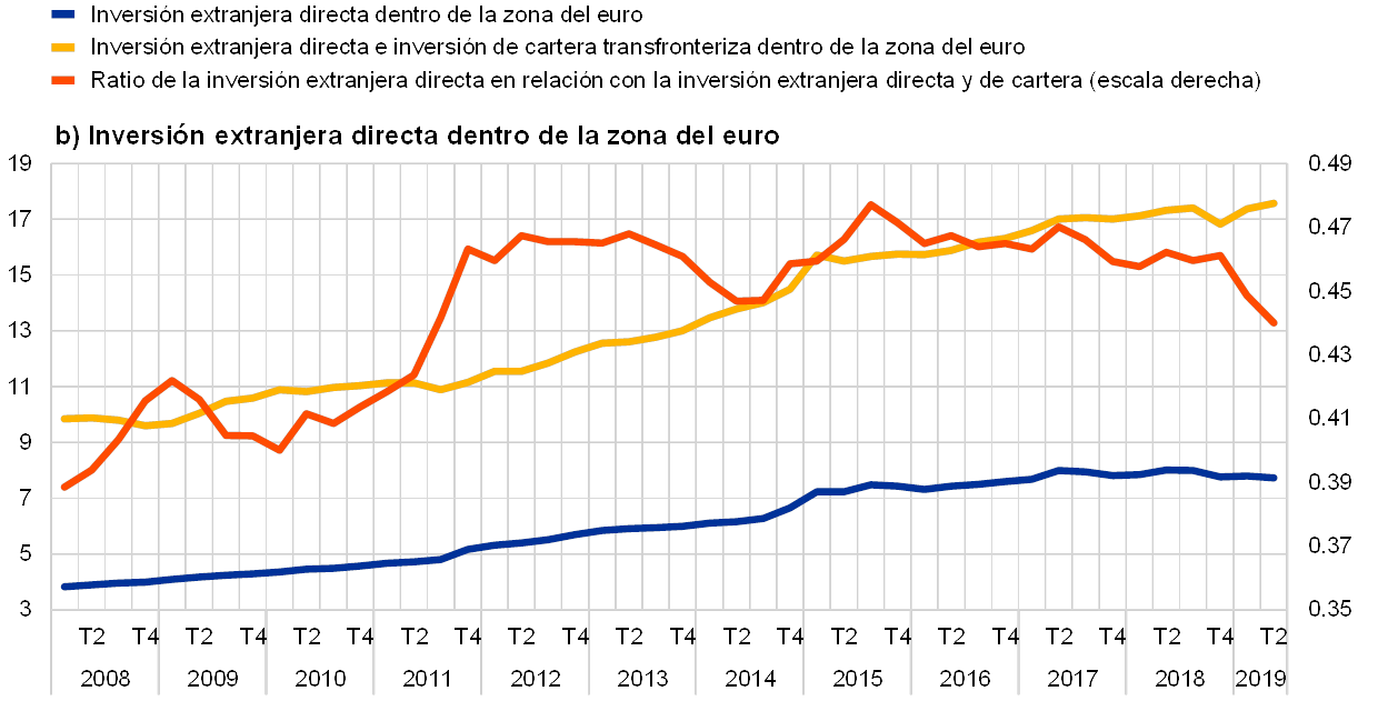 Fuentes: a) BCE y cálculos del BCE; b) BCE; c) BCE, cálculo del BCE basado en datos de la balanza de pagos y Eurostat; d) BCE.Notas: a) La línea azul muestra el importe total de las tenencias de valores de renta variable por parte de inversores de la zona del euro (todos los sectores) emitidos por residentes de otros países de la zona del euro. La línea amarilla muestra el importe total de las tenencias de valores representativos de deuda por parte de inversores de la zona del euro (todos los sectores) emitidos por residentes de otros países de la zona del euro. La línea naranja muestra la ratio de ambas. En el caso de las inversiones en valores de renta variable y en valores representativos de deuda, el total se refiere a la suma de las tenencias de activos transfronterizos y nacionales dentro de la zona del euro. b) La línea azul muestra el importe total de la inversión extranjera directa dentro de la zona del euro. La línea amarilla muestra la suma de la inversión extranjera directa dentro de la zona del euro y la inversión de cartera transfronteriza dentro de la zona del euro. La línea naranja muestra la ratio de ambas. c) La línea azul muestra el importe total de la deuda a largo plazo (con vencimiento superior a un año) emitida por los países de la zona del euro y mantenida por residentes de otros países de la zona del euro. La línea amarilla muestra el importe total de la deuda a corto plazo (con vencimiento inferior a un año) emitida por los países de la zona del euro y mantenida por residentes de otros países de la zona del euro. La línea naranja muestra la ratio de ambas. d) La línea azul muestra el importe total del crédito bancario transfronterizo dentro de la zona del euro a los hogares y a las sociedades no financieras, es decir, el crédito bancario al por menor. La línea amarilla muestra el importe total de préstamos transfronterizos dentro de la zona del euro entre IFM, es decir, los préstamos interbancarios. La línea naranja muestra la ratio de ambos. Para ahondar en el análisis de la interpretación de estos indicadores, véase la Sección Especial A «Financial integration and risk sharing in a monetary union» del informe del BCE de 2016 titulado «Financial integration in Europe».