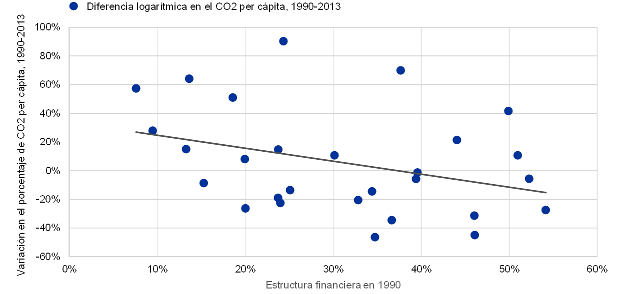 Fuentes: Los datos sobre las emisiones de carbono (kilotoneladas de CO2 per cápita) proceden de la Agencia Internacional de la Energía. Los datos sobre el crédito al sector privado y la capitalización bursátil proceden de la base de datos sobre la estructura financiera (Financial Structure Database) del Banco Mundial.Notas: Por «estructura financiera en 1990» se entiende la capitalización bursátil total dividida por la suma del crédito total al sector privado y la capitalización bursátil total multiplicada por 100, de cada país, en 1990. Los puntos del gráfico corresponden a los veintiocho países de la OCDE.