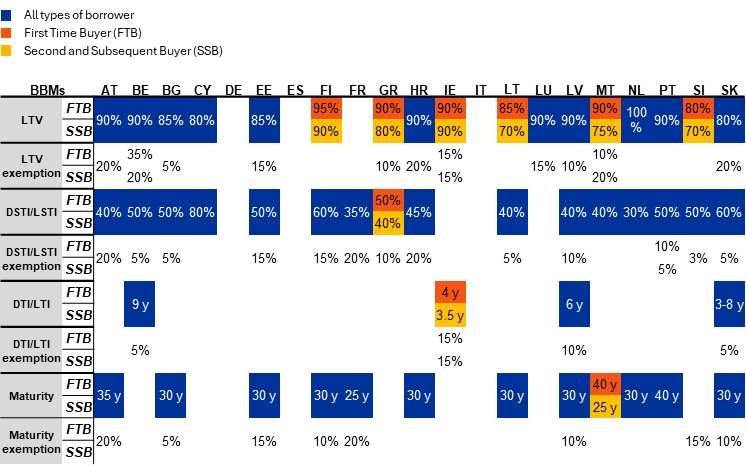 Notes: Only housing loans are considered. Austria: loan-to-collateral (LTC) limits are considered instead of LTV. Belgium: LTV exemption rates refer to first-time buyers (FTB) and second and subsequent buyers (SSB). DSTI and DTI measures are computed as follows: DSTI>50% x LTV>90% (+5% exemption) and DTI>9 x LTV>90% (+5% exemption). Bulgaria: the 5% exemption applies to all three limits (LTV, DSTI and maturity) simultaneously. Ireland: the LTV and loan-to-income (LTI) exemption rates refer to FTB/SSB and buy-to-let (BTL) loans. The LTV limit for BTL loans is 70%, with an exemption of up to 10%. Finland: the LTC limit is considered instead of LTV. Croatia: the table includes announced measures that will be implemented as of 1 July 2025. Luxembourg: LTV for other residential real estate loans, including BTL loans, is 80%, with no exemption. Latvia: LTV limit for BTL loans is 70%. Malta: a distinction is made between category I and category II borrowers for the LTV exemption. An exemption rate of 10% applies to category I borrowers and a 20% exemption rate applies to category II borrowers. Portugal: for the DSTI exemption, 10% of loans can be granted to borrowers with a DSTI of up to 60%, while 5% of total loans can be granted to borrowers with a DSTI above 60%. Slovakia: for the LTV exemption, the LTV ratio may be up to 90% for up to 20% of new loans. Slovenia: up to 15% of consumer loans may have a maturity of up to 120 months if compliant with the DSTI cap.