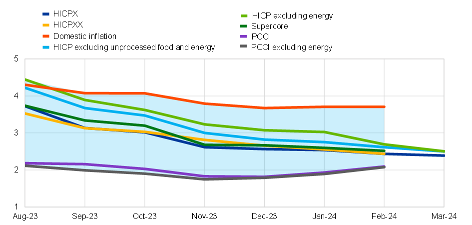 Notes: HICP refers to headline inflation, HICPX to HICP excluding food and energy, HICPXX to HICP excluding food, energy, travel-related items and clothing, and PCCI to Persistent and Common Component of Inflation. The “adjusted” measures abstract from energy and global supply bottleneck shocks using a large SVAR, as explained in Bańbura, M., Bobeica, E. and Martínez Hernández, C. (2023), “What drives core inflation? The role of supply shocks”, Working Paper Series, No 2875, ECB. The latest observations are for March 2024 (flash) for HICPX, HICP excluding energy and HICP excluding unprocessed food and energy, and February 2024 for the rest.