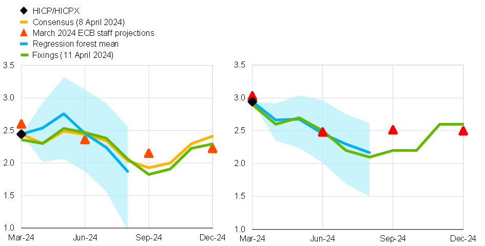 Notes: The cut-off date is 3 April 2024 for the regression forest and 11 April 2024 for fixings. Consensus Economics data were collected on 8 April 2024. The quantile regression forest estimates are from Lenza, M., Moutachaker, I. and Paredes, J. (2023), “Density forecasts of inflation: a quantile regression forest approach”, Working Paper Series, No 2830, ECB. The HICP fixings are observed market prices. The HICPX fixings are estimated based on the model in Grønlund, A.M., Jørgensen, K. and Schupp, F. (2024), “Measuring market-based core inflation expectations”, Working Paper Series, No 2908, ECB. The latest actual observation is for March 2024 (flash).
