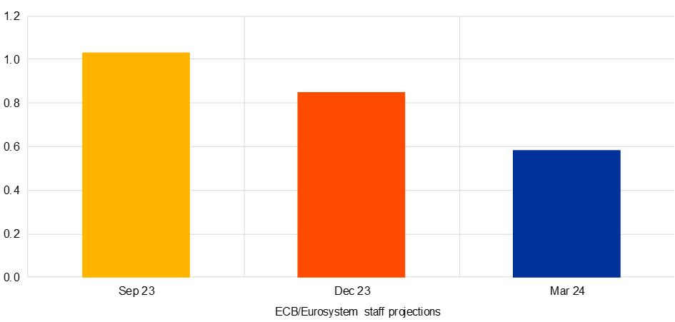 Sources: Eurostat, March 2024 ECB staff macroeconomic projections for the euro area, Consensus Economics, Bloomberg and ECB calculations.