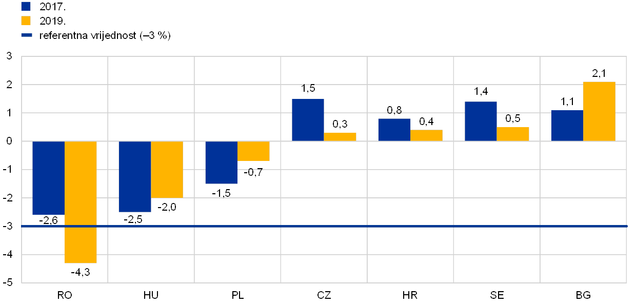 Osim toga, što se tiče država EU‑a, stavljanjem institucija u središte pozornosti samo se dobilo na analitičkoj i političkoj važnosti tijekom posljednjih godina. Stoga i nadalje, općenito govoreći, još uvijek ima dovoljno mjesta za poboljšanje mjerenja. Naposljetku, pristupi država složenom pitanju kao što su institucionalna kvaliteta ili dobro upravljanje nužno su donekle nedostatni i očito je da ih je potrebno dopuniti procjenama specifičnijim za pojedine države i dugoročnijim procjenama. Istodobno, poteškoće pri mjerenju ne bi trebale rezultirati narušavanjem tih važnih odrednica dugoročnog napretka, socijalne pravednosti i blagostanja. - U siječnju 2020. u srednjoročnom je cilju Hrvatske strukturni deficit promijenjen s 1,75 % BDP‑a na strukturni deficit od 1 % BDP‑a.