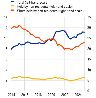 Over the last decade, foreign investors have been major holders of both euro area and US government debt, accounting for between one-fifth and one-third of all holdings of government debt in these economies. With around €2,600 billion at the end of the fourth quarter of 2024 (Table A.1), around 23% of outstanding euro area government debt was held by non-residents (Chart A.1). This share had started to decline when the Eurosystem acquired euro area government debt as part of its asset purchase programmes but has increased again since net purchases came to an end in mid-2022.[13] Holdings of US government debt exhibit a similar trend, as the share of non-resident holdings in total outstanding US Treasuries declined over the past decade and has recently risen to around 24%.[14]