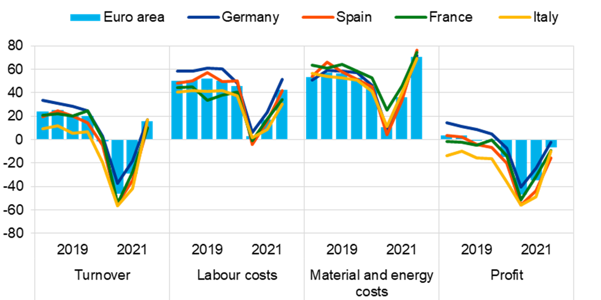 For the period from April to September 2021, small and medium-sized enterprises (SMEs) in the euro area reported an increase in turnover in net terms, reflecting the rebound in economic activity since the start of the coronavirus (COVID-19) pandemic (Chart 1).[1] On balance, they nonetheless continued to report lower profits as a result of increases in other costs (materials and energy) and labour costs. In net terms, 71% of euro area SMEs reported a rise in the cost of materials and energy, which is the highest percentage since the start of the survey in 2009. At the same time, 43% indicated that labour costs had gone up, which is still a smaller percentage than in the period just before the pandemic. In this survey round, SMEs signalled a net increase (11%) in their fixed investment across all countries and size classes. In the coming months, they expect the economic recovery to continue. In net terms, 36% foresee an increase in turnover over the next six months, which is a higher percentage than in the last survey round.