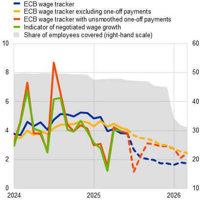 For the first quarter of 2026, the headline ECB wage tracker is at 1.7% (down from 1.8% in the fourth quarter of 2025 and 4.6% in the first quarter of 2025), the ECB wage tracker with unsmoothed one-off payments is at 2.5% (down from 3.0% in the fourth quarter of 2025 and at the same level as in the first quarter of 2025), and the ECB wage tracker excluding one-off payments is at 2.6% (down from 3.1% in the fourth quarter of 2025 and 4.4% in the first quarter of 2025). The employee coverage in the first quarter of 2026 is at 32.5% (decreasing from 45.3% in the previous quarter). The signals from the ECB wage tracker for the first quarter of 2026 are expected to become more complete as new wage agreements are signed. See Chart 1 and Table 1 for further details.