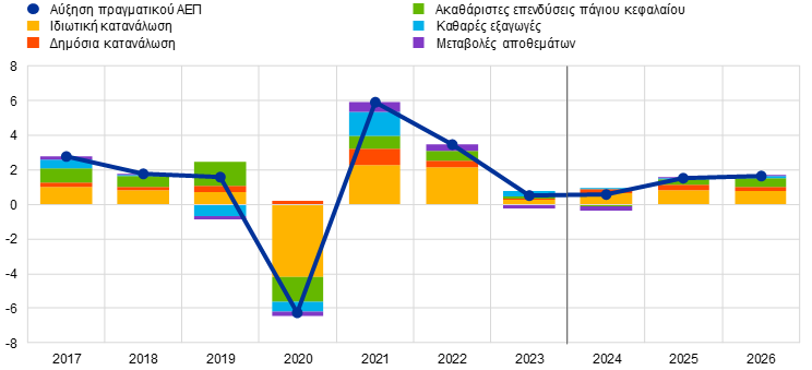 Ο ρυθμός αύξησης του πραγματικού ΑΕΠ αναμένεται να παραμείνει χαμηλός στις αρχές του 2024, εν μέσω της εξασθένησης των ευνοϊκών παραγόντων και αυστηρών συνθηκών χρηματοδότησης, και στη συνέχεια να ενισχυθεί, στηριζόμενος στην αύξηση του εισοδήματος των νοικοκυριών, τη δημόσια κατανάλωση και την εξωτερική ζήτηση. Η ώθηση στη δραστηριότητα από την επανεκκίνηση της οικονομίας μετά την πανδημία εξασθενεί, ενώ η αρνητική επίδραση των αυστηρών συνθηκών χρηματοδότησης και της αυξημένης αβεβαιότητας των καταναλωτών παραμένει σημαντική. Οι δείκτες ερευνών για τις μελλοντικές εξελίξεις παρέμειναν σε επίπεδα που κατά μέσο όρο υποδηλώνουν συρρίκνωση το πρώτο δίμηνο του 2024. Ωστόσο, η μείωση του πληθωρισμού και η σθεναρή αύξηση των μισθών, στο πλαίσιο μιας αγοράς εργασίας που εξακολουθεί να παρουσιάζει στενότητα, αναμένεται να ενισχύσουν την αγοραστική δύναμη των νοικοκυριών το α΄ εξάμηνο του τρέχοντος έτους. Επομένως, η οικονομική δραστηριότητα αναμένεται να στηριχθεί κυρίως από την ιδιωτική κατανάλωση. Ο ρυθμός ανάπτυξης εκτιμάται ότι θα επιταχυνθεί ελαφρώς περαιτέρω το β΄ εξάμηνο του 2024, ωθούμενος από την άνοδο της ιδιωτικής κατανάλωσης, εν μέσω αυξήσεων του πραγματικού διαθέσιμου εισοδήματος και αναμενόμενης ανάκαμψης της εμπιστοσύνης. Η δημόσια κατανάλωση προβλέπεται επίσης να αυξηθεί στη διάρκεια του 2024, εν μέρει αντανακλώντας την εμφανιζόμενη με χρονική υστέρηση επίδραση των μέτρων αντιστάθμισης του πληθωρισμού στους μισθούς του δημόσιου τομέα, ενώ η εξέλιξη των εξαγωγών αναμένεται να συγκλίνει περισσότερο με την εξέλιξη της εξωτερικής ζήτησης. Μεσοπρόθεσμα, ο ρυθμός αύξησης του πραγματικού ΑΕΠ αναμένεται να ενισχυθεί περαιτέρω σε επίπεδα οριακά υψηλότερα από τον προ της πανδημίας μέσο όρο, υποβοηθούμενος από την αύξηση των πραγματικών εισοδημάτων, την ενίσχυση της εξωτερικής ζήτησης και την εξασθένηση των αρνητικών επιδράσεων της νομισματικής και της δημοσιονομικής πολιτικής (Πίνακας 2). Η απόσυρση των μέτρων δημοσιονομικής στήριξης που έχουν θεσπιστεί από το 2022 και εξής για την αντιστάθμιση του υψηλού πληθωρισμού και των τιμών της ενέργειας θα έχει μικρό αρνητικό αντίκτυπο στην ανάπτυξη την περίοδο 2024-26, αλλά η συνολική κατεύθυνση της δημοσιονομικής πολιτικής θα είναι σε γενικές γραμμές ουδέτερη την περίοδο 2025-26.