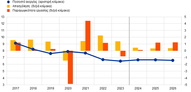 Η αγορά εργασίας παραμένει ανθεκτική, αν και η δυναμική της υποχωρεί κάπως, καθώς η αύξηση της απασχόλησης αναμένεται να εξομαλυνθεί σε σχέση με τους υψηλούς ρυθμούς που κατέγραψε το 2023. Σε γενικές γραμμές όπως είχε προβλεφθεί στις προβολές του Δεκεμβρίου 2023, ο ρυθμός αύξησης της συνολικής απασχόλησης αναμένεται να επιβραδυνθεί από 1,4% το 2023 σε 0,5% το 2024 και να σταθεροποιηθεί σε 0,3% και 0,4% το 2025 και το 2026 αντίστοιχα (Διάγραμμα 3). Ο ρυθμός αύξησης της παραγωγικότητας της εργασίας αναμένεται να ενισχυθεί στη διάρκεια του χρονικού ορίζοντα προβολής, αλλά τα επίπεδα παραγωγικότητας το 2026 φαίνεται ότι θα παραμείνουν σημαντικά χαμηλότερα από τη μακροχρόνια γραμμική τάση. Το ποσοστό ανεργίας αναμένεται να ακολουθήσει αρχικά ελαφρά ανοδική πορεία και στη συνέχεια ελαφρά πτωτική: αντιδρώντας με χρονική υστέρηση στην εξασθένηση της οικονομικής δραστηριότητας, εκτιμάται ότι θα αυξηθεί σε 6,7% το 2024 και θα μειωθεί σε 6,6% το 2025 και το 2026. Το ποσοστό ανεργίας της ζώνης του ευρώ αναθεωρήθηκε προς τα πάνω κατά 0,1 ποσ. μον. για το 2024 και το 2025 και κατά 0,2 ποσ. μον. για το 2026.