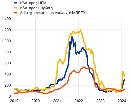Πηγές: PortWatch του ΔΝΤ, Bloomberg, Haver Analytics, δείκτης HARPEX (Harper Petersen Charter Rates Index), Freightos Baltic Index (FBX), S &P Global και υπολογισμοί των εμπειρογνωμόνων της ΕΚΤ.