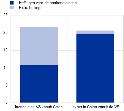 Het effect van deze bilaterale heffingen op de projecties voor het eurogebied is beperkt, hoewel China zoals in het verleden zijn handelsverkeer zou kunnen verleggen. In 2018 leidden de Amerikaanse heffingen op Chinese goederen tot een verlegging van de Chinese uitvoer naar andere markten, doordat Amerikaanse toeleveringsketens werden geheroriënteerd om de directe inkoop uit China te verminderen. Als China zijn uitvoer weg van de Verenigde Staten verlegt, kan het concurrentievermogen van het eurogebied zowel op de binnenlandse als op derde markten afnemen. Tegelijkertijd is het potentieel van het eurogebied om marktaandeel te winnen in de Verenigde Staten mogelijk beperkt, gezien de verschillen in zowel de kwaliteit als de prijzen van het uitvoerpakket van het eurogebied ten opzichte van China. Al met al wordt echter slechts een zeer licht negatief effect van deze heffingen op de groei van het eurogebied verwacht. Wat de inflatie in het eurogebied betreft, wordt ervan uitgegaan dat de in het basisscenario opgenomen heffingen weinig gevolgen hebben, aangezien het opwaartse effect ervan op de invoerprijzen via hogere kosten binnen de toeleveringsketens naar verwachting grotendeels wordt gecompenseerd door de neerwaartse invloed van het grotere aanbod van goederen vanuit China op de Europese markten.
