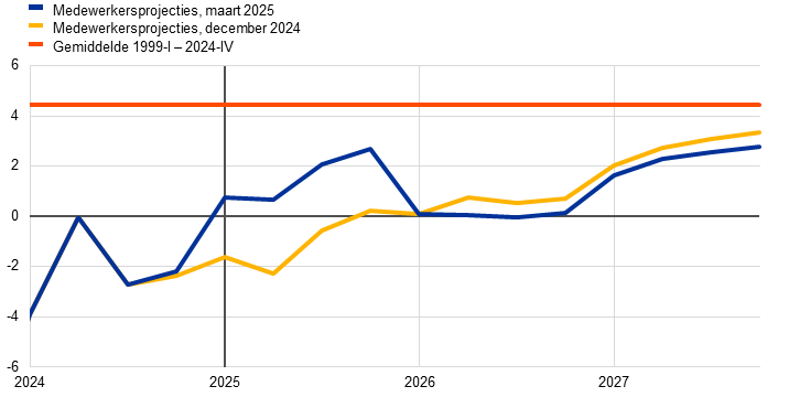 De aanhoudend grote geopolitieke en beleidsonzekerheid zal naar verwachting de economische groei in het eurogebied drukken en het voorziene herstel vertragen. Dit volgt op de iets zwakker dan verwachte groei van eind 2024. Zowel de binnenlandse als de handelsonzekerheid zijn groot. Hoewel in de basisprojectie alleen het effect van nieuwe heffingen op de handel tussen de Verenigde Staten en China is opgenomen, wordt aangenomen dat de negatieve effecten van onzekerheid over de mogelijkheid van verdere veranderingen in het mondiale handelsbeleid, met name ten aanzien van de Europese Unie, de uitvoer en de investeringen van het eurogebied zullen drukken. In combinatie met aanhoudende uitdagingen op het gebied van het concurrentievermogen leidt dit naar verwachting tot een verdere daling van het marktaandeel van het eurogebied bij de uitvoer. Ondanks deze tegenwind blijven de voorwaarden aanwezig voor een opleving van de bbp-groei in het eurogebied gedurende de projectieperiode. Stijgende reële lonen en werkgelegenheid zullen, tegen de achtergrond van een sterke, zij het afkoelende arbeidsmarkt naar verwachting een herstel ondersteunen waarbij de consumptie een belangrijke bijdrage blijft leveren aan de groei. De binnenlandse vraag zou ook moeten worden geschraagd door een versoepeling van de financieringsvoorwaarden, in overeenstemming met de marktverwachtingen over het toekomstige rentebeloop. De arbeidsmarkt zou veerkrachtig moeten blijven, met een werkloosheidspercentage van gemiddeld 6,3% in 2025 en een lichte daling tot 6,2% in 2027. Aangezien sommige conjuncturele factoren die onlangs geleid hebben tot productiviteitsvermindering beginnen weg te ebben, trekt de productiviteit gedurende de projectieperiode weer aan, al blijven structurele uitdagingen bestaan. Verwacht wordt dat de gemiddelde reële bbp-groei op jaarbasis al bij al uitkomt op 0,9% in 2025 en aantrekt tot 1,2% in 2026 en 1,3% in 2027. Vergeleken met de door medewerkers van het Eurosysteem samengestelde macro-economische projecties van december 2024 zijn de vooruitzichten voor de bbp-groei voor zowel 2025 als 2026 neerwaarts bijgesteld met 0,2 procentpunt, maar voor 2027 onveranderd gebleven. De zwakkere vooruitzichten zijn voornamelijk toe te schrijven aan neerwaartse bijstellingen van de uitvoer en, in mindere mate, aan de investeringen, als gevolg van een sterker dan eerder aangenomen onzekerheidseffect, alsook de verwachting dat de uitdagingen op het gebied van het concurrentievermogen waarschijnlijk langer zullen aanhouden dan voorzien.[1]