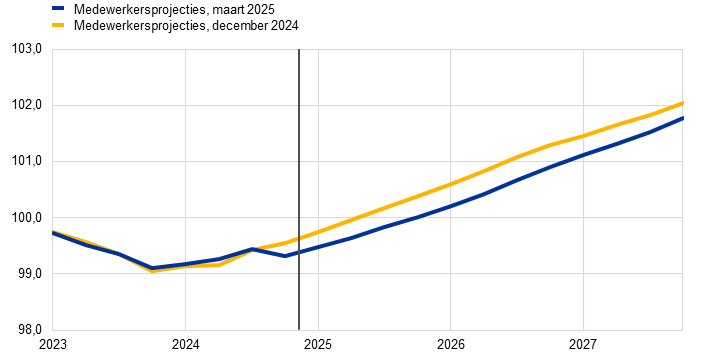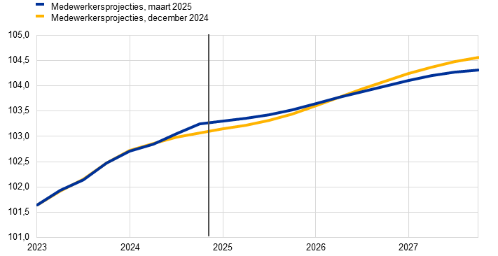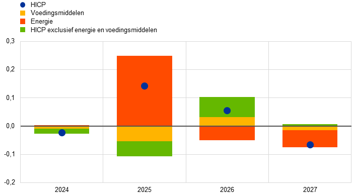 De totale HICP-inflatie is de afgelopen maanden gestegen, maar zal naar verwachting in de loop van 2025 enigszins matigen en vervolgens dalen, om vanaf het eerste kwartaal van 2026 rond de inflatiedoelstelling van de ECB van 2,0% te schommelen. Aan het begin van de projectieperiode zullen opwaartse basiseffecten in de energiecomponent en een hogere voedselprijsinflatie de neerwaartse effecten van een daling van de HICP-inflatie exclusief energie en voedingsmiddelen (HICPX) grotendeels compenseren. De stijging van de prijzen van energiegrondstoffen rond de jaarwisseling zal in 2025 doorwerken in het twaalfmaands mutatietempo van de energieprijzen. Hoewel de aanname is dat de prijzen van olie en gas in lijn met de futuresprijzen zullen dalen, blijft de energie-inflatie gedurende de gehele projectieperiode waarschijnlijk positief, zij het lager dan het historisch gemiddelde. In 2027 zal de energie-inflatie volgens de projecties worden opgedreven door de invoering van nieuwe maatregelen ter beperking van de klimaatverandering. De voedselinflatie stijgt naar verwachting tot medio 2025, voornamelijk als gevolg van recente forse stijgingen van de prijzen van voedingsgrondstoffen, alvorens te dalen tot gemiddeld 2,2% in 2027. Verwacht wordt dat de HICPX-inflatie begin 2025 gaat dalen naarmate de effecten van vertraagde herbeprijzingen wegebben, de loondruk afneemt en het effect van eerdere monetairbeleidsverkrapping blijft doorwerken in de consumptieprijzen. De daling van de HICPX-inflatie wordt naar verwachting voornamelijk veroorzaakt door de teruglopende diensteninflatie – die tot dusver relatief hardnekkig is geweest. Al met al matigt de HICPX-inflatie van 2,2% in 2025 tot 1,9% in 2027. De loongroei zou een neerwaarts traject moeten blijven volgen ten opzichte van het huidige nog steeds hoge niveau naarmate de druk van de inflatiecompensatie wegebt. In combinatie met het voorziene herstel van de productiviteitsgroei leidt dit naar verwachting tot een aanzienlijk tragere groei van de arbeidskosten per eenheid product. Als gevolg daarvan neemt de binnenlandse prijsdruk verder af, waarbij de winstmarges zich gedurende de projectieperiode herstellen. De externe prijsdruk, zoals weerspiegeld in de invoerprijzen, blijft naar verwachting gematigd, in de veronderstelling dat het handelsbeleid van de EU op het vlak van heffingen ongewijzigd blijft. Vergeleken met de projecties van december 2024 zijn de vooruitzichten voor de totale HICP-inflatie voor 2025 opwaarts bijgesteld met 0,2 procentpunt als gevolg van hogere aannames voor de prijzen van energiegrondstoffen en de depreciatie van de euro, terwijl deze voor 2027 licht neerwaarts zijn bijgesteld vanwege de iets zwakkere vooruitzichten voor de energiecomponent aan het einde van de projectieperiode.
