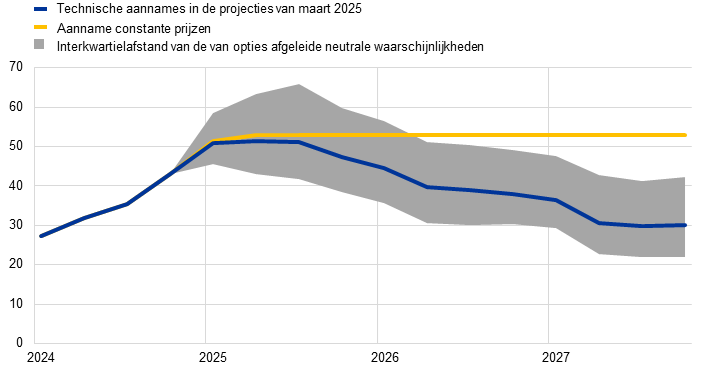 Toelichting: De van opties afgeleide waarschijnlijkheden voor de olie- en gasprijzen zijn op 6 februari 2025 afgeleid uit de marktnoteringen voor opties op ruwe olie van ICE Brent en gasfutures van Dutch TTF met vaste driemaandelijkse vervaldata.