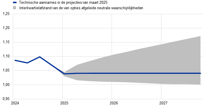 Toelichting: Een stijging impliceert een appreciatie van de euro. Het 25e en het 75e percentiel hebben betrekking op de van opties afgeleide neutrale waarschijnlijkheden voor de USD/EUR-wisselkoers op 6 februari 2025. De macro-economische effecten worden gerapporteerd als gemiddelden van een aantal macro-economische modellen van medewerkers van de ECB en het Eurosysteem.