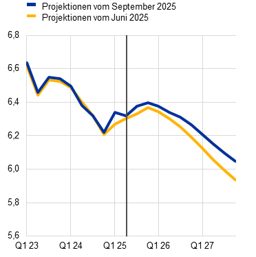 Die Inflationsaussichten stehen mit einer Stabilisierung der Inflation in der Nähe des mittelfristigen Ziels von 2 % im Einklang. Die am Harmonisierten Verbraucherpreisindex (HVPI) gemessene Gesamtinflation dürfte den Projektionen zufolge im weiteren Jahresverlauf 2025 bei rund 2 % verharren, bevor sie 2026 auf 1,7 % zurückgeht und 2027 wieder auf 1,9 % ansteigt. Der Rückgang im Jahr 2026 spiegelt eine weitere allmähliche Abschwächung der Nicht-Energie-Komponenten wider, während die Energiepreise den Erwartungen zufolge volatil bleiben werden. Sie dürften über den Projektionszeitraum hinweg jedoch ansteigen, unter anderem wegen der Einführung des EU-Emissionshandelssystems 2 (EU-EHS 2) im Jahr 2027. Die Teuerung bei Nahrungsmitteln dürfte zunächst erhöht bleiben, da sich die vergangenen Anstiege der internationalen Nahrungsmittelrohstoffpreise mit Verzögerung auswirken. In den Jahren 2026 und 2027 dürfte die betreffenden Raten jedoch auf Werte von etwas über 2 % zurückgehen. Die HVPI-Inflation ohne Energie und Nahrungsmittel (HVPIX) dürfte sinken. Dies ist auf nachlassenden Lohndruck und eine rückläufige Teuerung bei Dienstleistungen zurückzuführen. Ein weiterer Grund ist die Aufwertung des Euro, die auf die Preissetzungskette durchwirkt und die Teuerung bei Waren dämpft. Das geringere Lohnwachstum – zurückliegende Reallohnverluste wurden wettgemacht – dürfte zusammen mit einer Erholung des Produktivitätswachstums zu einem deutlich langsameren Anstieg der Lohnstückkosten führen. Im Vergleich zu den Projektionen vom Juni 2025 wurden die Aussichten für die HVPI-Gesamtinflation für 2025 und 2026 um jeweils 0,1 Prozentpunkte nach oben revidiert. Gründe hierfür sind höhere tatsächliche und angenommene Werte für die Energierohstoffpreise sowie verzögerte Auswirkungen der höheren internationalen Nahrungsmittelrohstoffpreise, die die Aufwertung des Euro mehr als ausglichen. Für das Jahr 2027 werden die verzögerten Auswirkungen der Euro-Aufwertung als vorherrschend betrachtet, was zu einer Abwärtskorrektur um 0,1 Prozentpunkte führt.