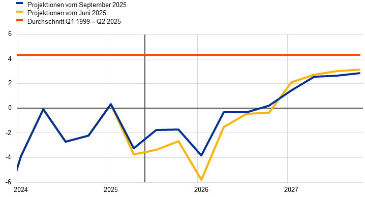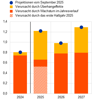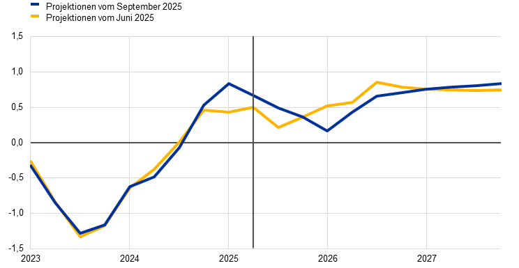 Handelszölle und die damit verbundene Unsicherheit trugen in der ersten Jahreshälfte 2025 zu starken Konjunkturschwankungen bei, wobei vor allem in Irland Wirtschaftstätigkeiten vorgezogen wurden. Das Abklingen dieser Faktoren in der zweiten Jahreshälfte dürfte weitere Volatilität nach sich ziehen und Signale der zugrunde liegenden konjunkturellen Dynamik im Euroraum trüben. Lässt man die Volatilität, die durch die Schwankungen der irischen Daten bedingt ist, außer Acht, so war das Wirtschaftswachstum im übrigen Euroraum stabiler, und das dürfte auch in der zweiten Jahreshälfte so bleiben. Auch wenn das neue Handelsabkommen zwischen den USA und der EU höhere Zölle auf Ausfuhren des Euroraums in die Vereinigten Staaten mit sich bringt, so hat es doch dazu beigetragen, die handelspolitische Unsicherheit zu verringern. Im weiteren Verlauf des Projektionszeitraums dürfte sich das Wirtschaftswachstum im Euroraum beschleunigen, was auf mehrere Faktoren zurückzuführen ist. Steigende Reallöhne und Beschäftigungszahlen dürften zusammen mit neuen Staatsausgaben für Infrastruktur und Verteidigung, insbesondere in Deutschland, die Binnennachfrage im Euroraum stärken. Darüber hinaus dürften auch weniger restriktive Finanzierungsbedingungen, deren Ursache hauptsächlich die jüngsten geldpolitischen Beschlüsse sind, sowie eine Erholung der Auslandsnachfrage im Jahr 2027 die Wachstumsaussichten stützen. Die durchschnittliche Jahreswachstumsrate des realen BIP dürfte den Projektionen zufolge 2025 um 1,2 %, 2026 um 1,0 % und 2027 um 1,3 % steigen. Im Vergleich zu den von Fachleuten des Eurosystems erstellten gesamtwirtschaftlichen Projektionen vom Juni 2025 wurde der Ausblick für das BIP-Wachstum für 2025 um 0,3 Prozentpunkte nach oben revidiert. Gründe hierfür sind, dass neu verfügbare Daten besser als erwartet ausfielen und die Revision historischer Daten zu einem Übertragungseffekt führte. Da nicht alle unerwarteten Daten darauf zurückzuführen sind, dass Wirtschaftstätigkeiten stärker als zuvor angenommen vorgezogen wurden, dürften sie in der zweiten Jahreshälfte nur teilweise ausgeglichen werden. Die Aufwertung des Euro und die schwächere Auslandsnachfrage (teilweise aufgrund etwas höherer Zölle als in den Juni-Projektionen angenommen) haben zu einer Abwärtsrevision um 0,1 Prozentpunkte für 2026 geführt. Die Projektion für 2027 bleibt unverändert.[1]