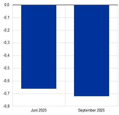 Gegenüber den Projektionen vom Juni 2025 sind die wichtigsten Änderungen der technischen Annahmen höhere Ölpreise, niedrigere Gas- und Rohstoffpreise und ein stärkerer Euro-Wechselkurs. Die Zinsannahmen bleiben indes weitgehend unverändert. Die Ölpreisannahmen wurden für 2025 bis 2027 um durchschnittlich rund 3 % nach oben und die Strompreisannahmen um rund 2 % nach oben revidiert, während die Annahmen für die Großhandelspreise für Gas etwas nach unten revidiert wurden. Auch für im EU-Emissionshandelssystem 1 gehandelte Zertifikate (EU-EHS1-Zertifikate) wird ein etwas niedrigerer Preis angenommen, während der Preis für das EU-Emissionshandelssystem 2 (EU-EHS2) unverändert gelassen wurde. Die Preise für Rohstoffe ohne Energie wurden leicht nach unten revidiert. Der Euro hat seit den Projektionen vom Juni zum US-Dollar um 3,3 % und in nominaler effektiver Rechnung um 2,3 % aufgewertet. Die Annahmen für die Zinssätze sind weitgehend unverändert.