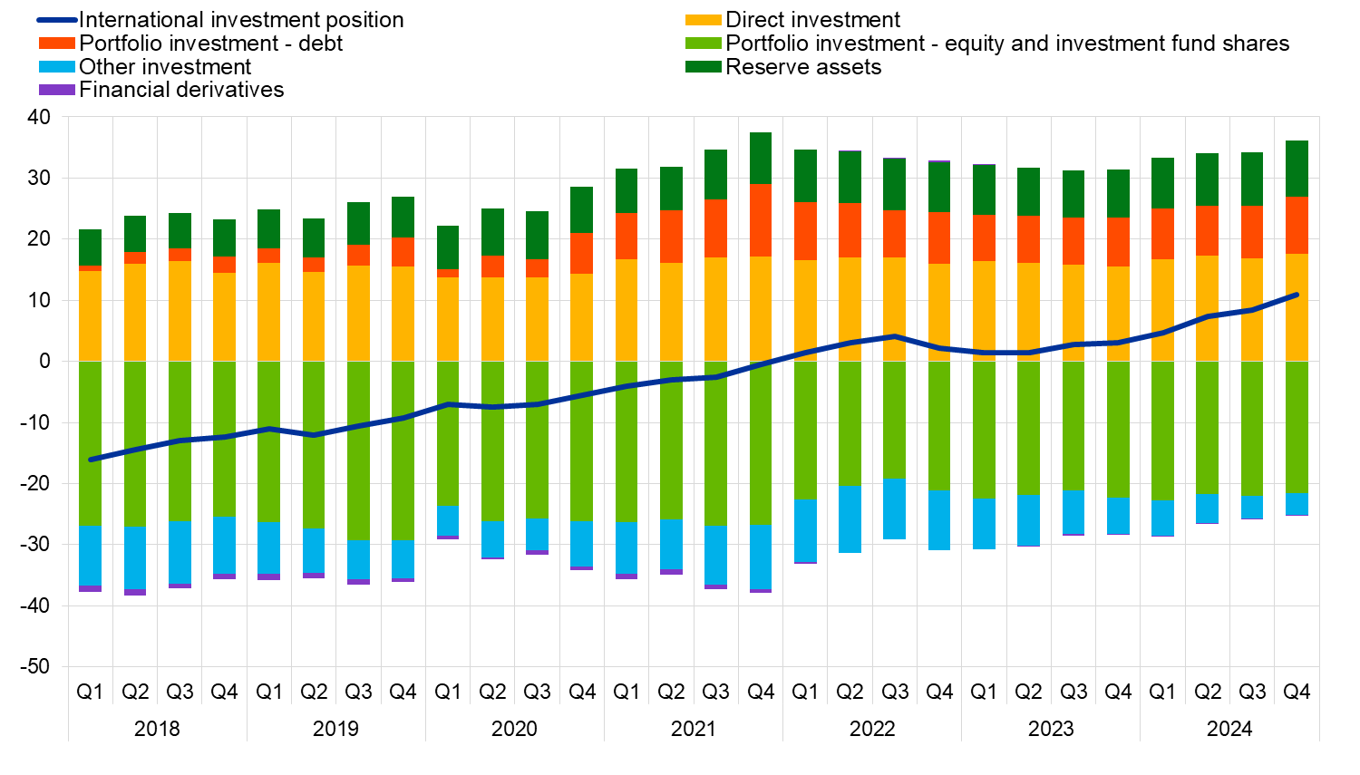 At the end of 2024, the international investment position of the euro area recorded net assets of €1.66 trillion vis-à-vis the rest of the world (10.9 % of euro area GDP), up from €1.25 trillion in the previous quarter (Chart 2 and Table 2).