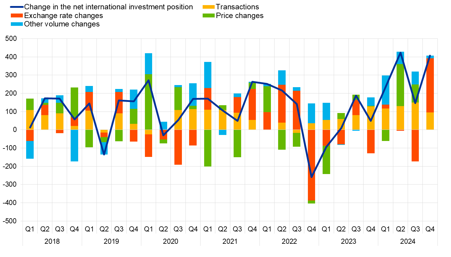The developments in the euro area’s net international investment position in the fourth quarter of 2024 were driven mainly by positive exchange rate changes, and to a lesser extent by positive transactions and other volume changes (Table 2 and Chart 3).