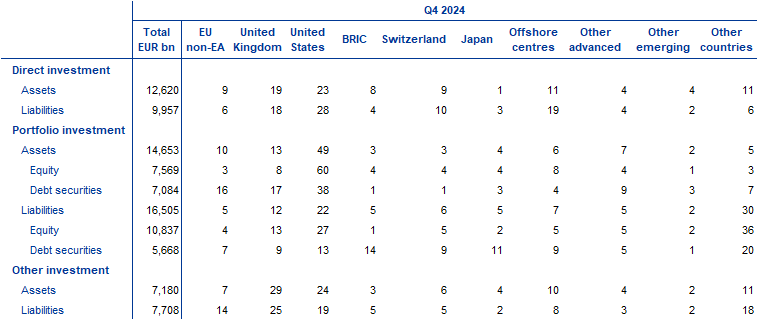 At the end of 2024 euro area direct investment assets were €12.62 trillion, 23% of which was invested in the United States and 19% in the United Kingdom (see Table 3). Euro area direct investment liabilities were €9.96 trillion, with 28% being investments from the United States, 19% from offshore centres and 18% from the United Kingdom.