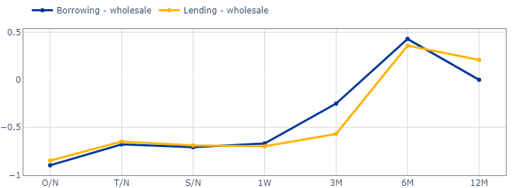 Weighted average rate for wholesale sector borrowing and lending in the secured segment by tenor