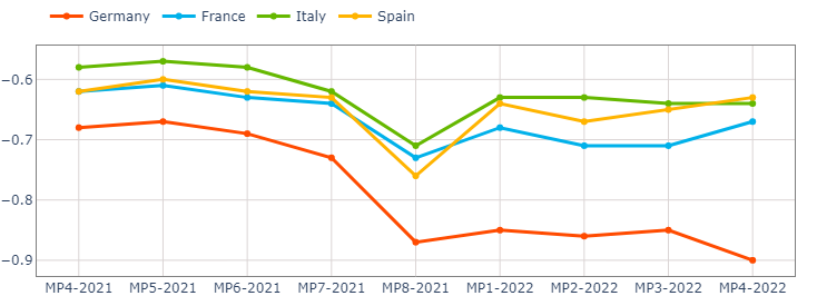 In the fourth maintenance period of 2022, the borrowing turnover in the secured segment averaged €414 billion per day, while the total borrowing turnover for the period as a whole was €12,410 billion. Cash lending represented a turnover of €10,319 billion and the daily average amounted to €344 billion. Most of the turnover was concentrated in tenors ranging from overnight to up to one week, with overnight transactions representing around 25% and 22% of the total nominal amount on borrowing and lending side respectively. The weighted average overnight rate for borrowing and lending transactions was, respectively, -0.90% and -0.85% for the wholesale sector, compared with -0.74% and -0.71% in the previous maintenance period. In the fourth maintenance period of 2022, the weighted average rate for spot/next borrowing transactions ranged from -0.63% for operations based on collateral issued in Spain to -0.90% for operations based on collateral issued in Germany.