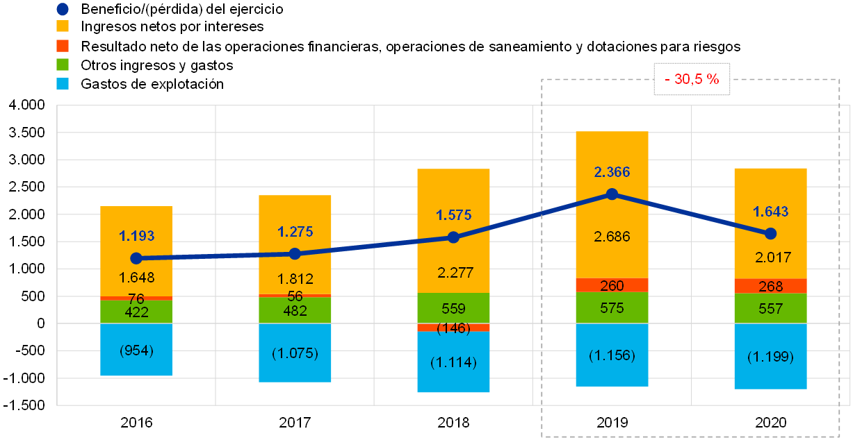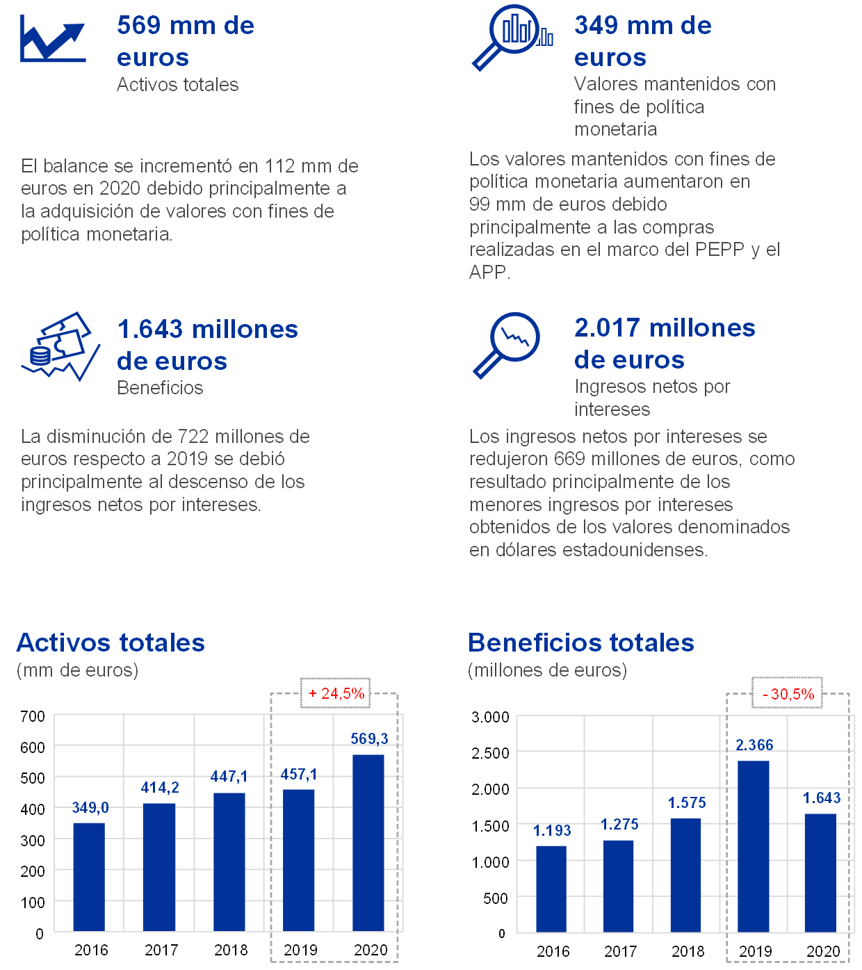 Los beneficios del BCE en 2020 fueron de 1.643 millones de euros (2.366 millones en 2019). La disminución de 722 millones de euros respecto a 2019 se debió principalmente al descenso de los ingresos netos por intereses.