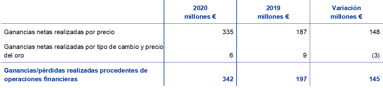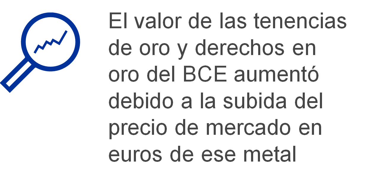 El valor equivalente en euros de las tenencias de oro y derechos en oro del BCE se incrementó en 3,1 mm, situándose en 25,1 mm de euros en 2020 (véase gráfico 4), debido a un aumento del precio de mercado en euros de ese metal, aunque no varió el volumen de estas tenencias de onzas de oro fino. Este aumento también dio lugar a un incremento equivalente en las cuentas de revalorización del oro del BCE (véase apartado 1.3.2 Recursos financieros).