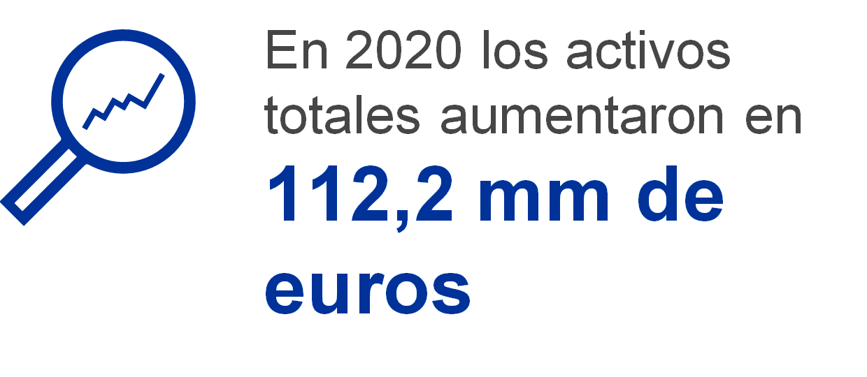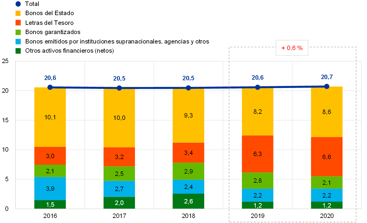 En 2020, los activos totales del BCE aumentaron en 112,2 mm, situándose en 569,3 mm de euros, debido principalmente a su participación en las compras de valores en el marco del nuevo programa de compras de emergencia frente a la pandemia (PEPP)[6] y el APP. Estas compras se tradujeron en un incremento en la partida «Valores mantenidos con fines de política monetaria», mientras que su liquidación en efectivo en cuentas TARGET2 dio lugar al consiguiente aumento en la partida «Cuentas intra-Eurosistema». El incremento del valor de los billetes en euros en circulación también contribuyó a este aumento.