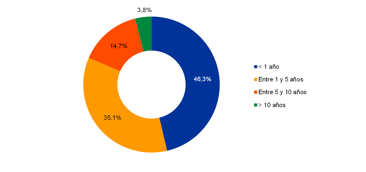La cartera de recursos propios del BCE se compone principalmente de las inversiones de los recursos financieros del BCE, a saber, su capital desembolsado, los importes mantenidos en el fondo de reserva general y la provisión para riesgos financieros. Debido a la reinversión de los ingresos obtenidos y a la valoración a precios de mercado de los valores, el volumen de la cartera de recursos propios no se corresponde necesariamente con el de los recursos financieros mencionados. El objeto de esta cartera es proporcionar al BCE los ingresos necesarios para ayudarle a hacer frente a gastos de explotación no relacionados con el desempeño de sus tareas de supervisión[13]. La cartera se invierte en activos denominados en euros dentro de los límites que impone su marco de control de riesgos, lo que da lugar a una estructura de vencimientos más diversificada (véase gráfico 9) que en la cartera de reservas exteriores.