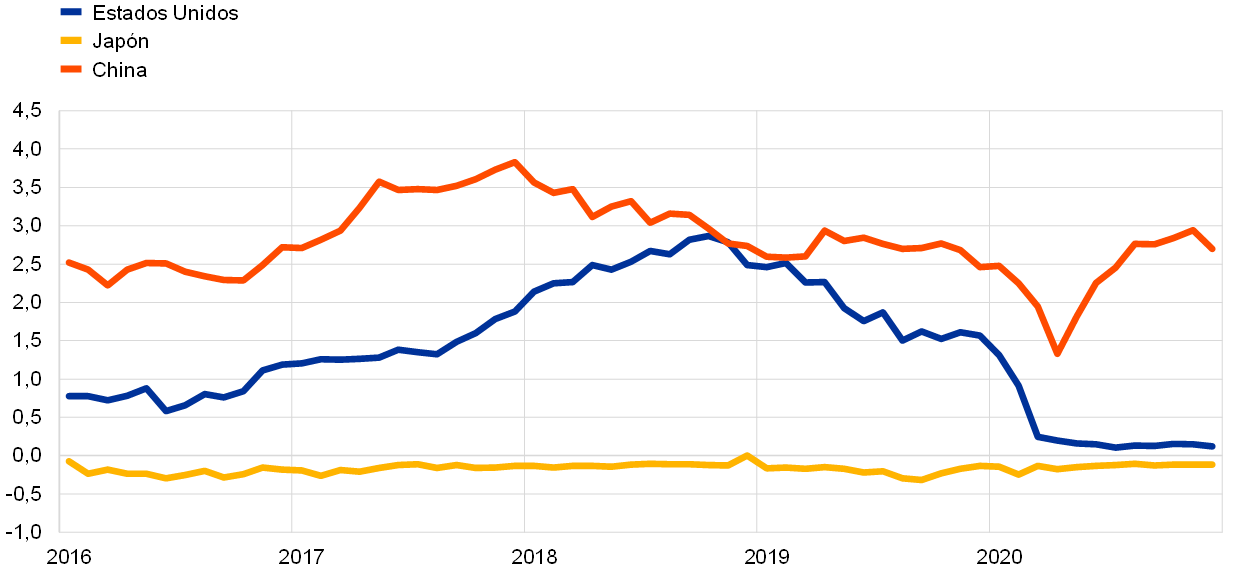 Rendimientos de la deuda soberana a dos años en Estados Unidos, Japón y China
