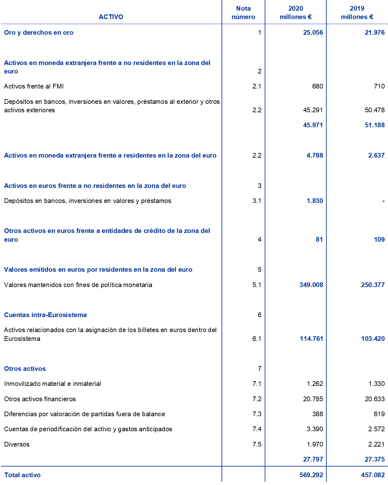 A final de 2020, el valor total de los billetes en circulación ascendía a 1.434,5 mm de euros, lo que supone un incremento del 11 % respecto al final de 2019. Al BCE se le ha asignado una participación del 8 % del valor total de los billetes en euros en circulación, que ascendía a 114,8 mm de euros a final del año. Dado que el BCE no pone los billetes en circulación, mantiene activos intra-Eurosistema frente a los BCN de la zona del euro por un importe equivalente al valor de esos billetes.