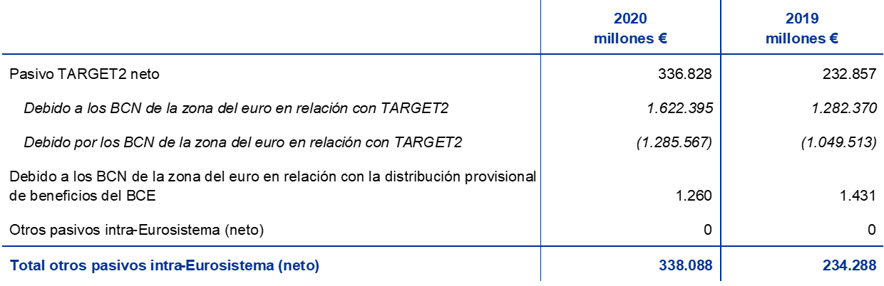 Los pasivos intra-Eurosistema del BCE, que comprenden fundamentalmente los saldos netos en TARGET2 de los BCN de la zona del euro frente al BCE y los pasivos del BCE relacionados con las reservas en moneda extranjera que los BCN de la zona del euro le transfirieron en el momento de su incorporación al Eurosistema, se incrementaron en 103,8 mm, situándose en 378,4 mm de euros en 2020. El aumento de los pasivos intra-Eurosistema en 2020, así como su evolución en el período 2016-2019, se debió principalmente a la evolución del pasivo neto TARGET2 como resultado de las adquisiciones netas por el BCE de valores mantenidos con fines de política monetaria, que se liquidan en cuentas de TARGET2 (véase gráfico 10).