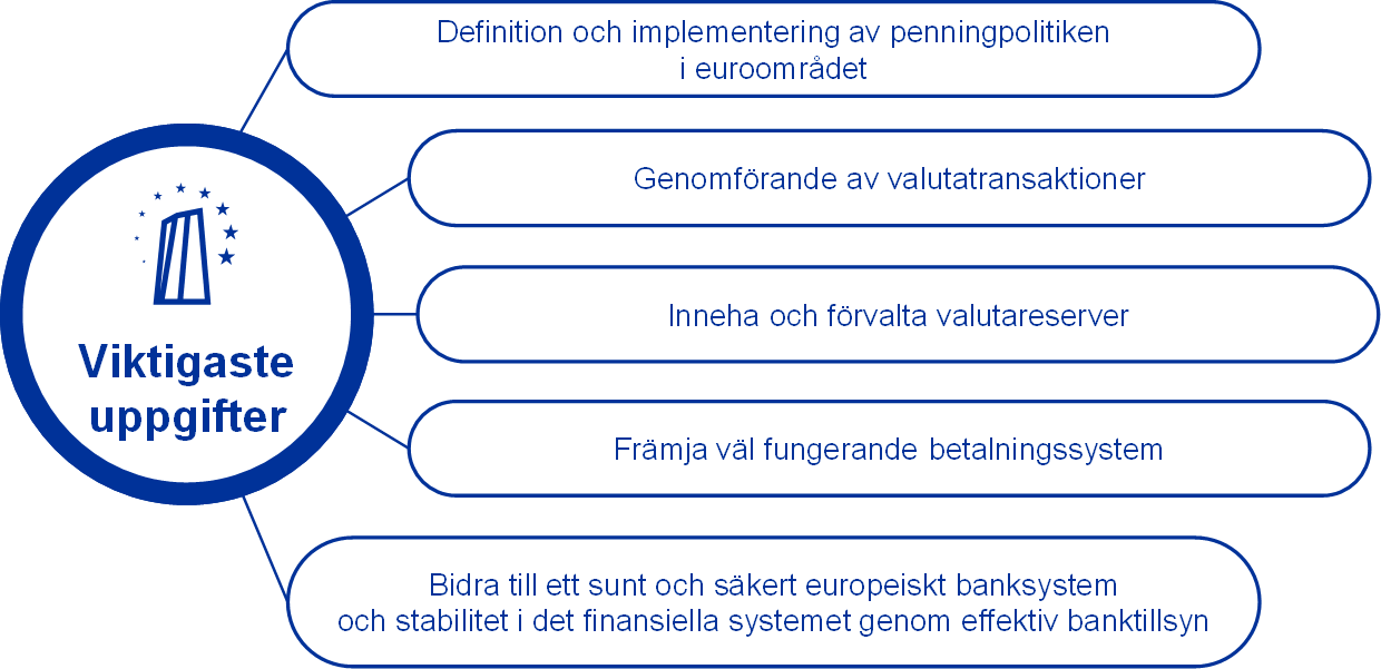 ECB ingår i Eurosystemet, vars främsta mål är att upprätthålla prisstabiliteten. ECB utför sina arbetsuppgifter mål och uppgifter vilka fastställs i fördraget om Europeiska unionens funktionssätt[3]och i stadgan för Europeiska centralbankssystemet och Europeiska centralbanken[4] (diagram 1). ECB bedriver sina verksamheter för att uppfylla sitt mandat och inte för att generera vinst.