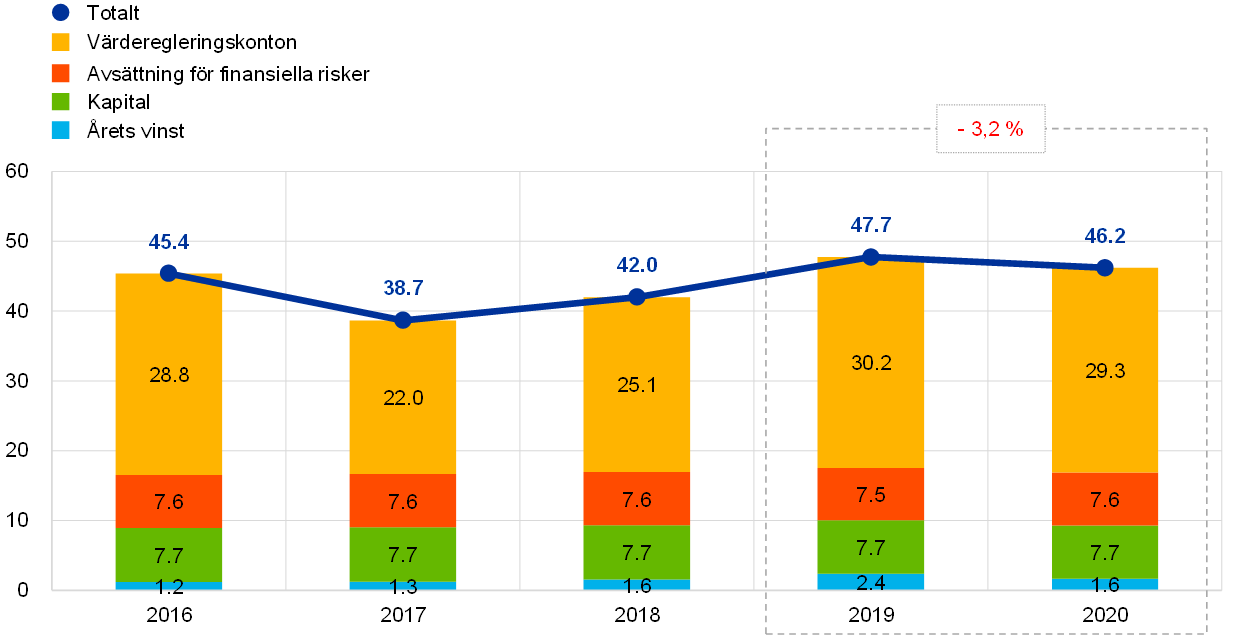 ECB:s finansiella resurser består av dess kapital, avsättning för finansiella risker, värderegleringskonton och årets vinst. Dessa finansiella resurser i) investeras i tillgångar som genererar intäkter och/eller ii) används för att direkt uppväga förluster som uppstår genom finansiella risker. Per den 31 december 2020 uppgick ECB:s finansiella resurser totalt till 46,2 miljarder euro (diagram 11). Detta var 1,5 miljarder euro lägre än 2019, främst på grund av i) minskningen av värderegleringskontona till följd av eurons appreciering gentemot US-dollarn och ii) den lägre vinsten 2020.