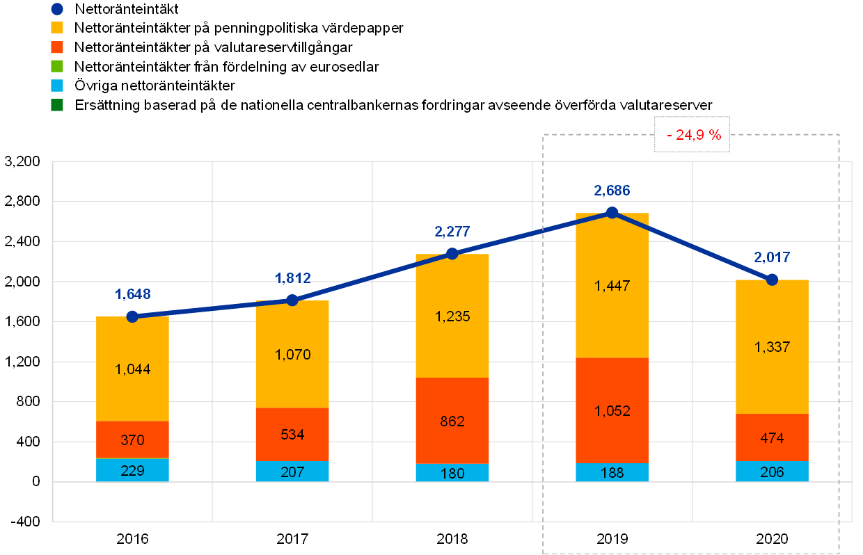 Både ränteintäkter på ECB:s andel av totalt antal eurosedlar i omlopp och räntekostnader för de nationella centralbankernas fordringar avseende överförda valutareserver var noll som resultat av den 0-procentiga ränta som Eurosystemet under 2020 använde i sina huvudsakliga refinansieringstransaktioner.