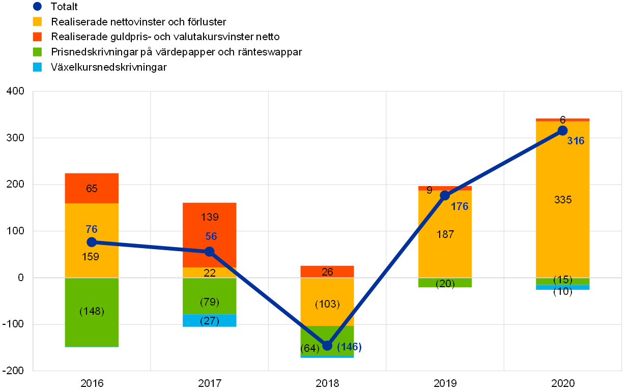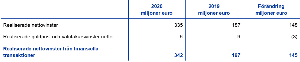Nettoresultatet av finansiella transaktioner och nedskrivningar på finansiella tillgångar uppgick till en vinst på 316 miljoner euro (diagram 18). Detta resultat var 139 miljoner euro högre än 2019, främst beroende på högre realiserade nettovinster.